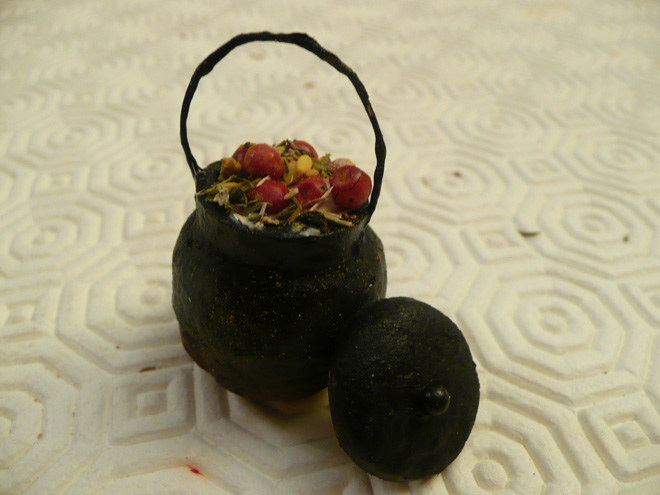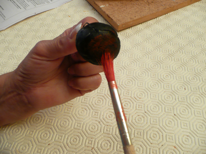 PASO 6: Pintamos el caldero de color negro por dentro y por fuera, así como la tapadera, y aplicamos una pequeña veladura de color rojo en la base.