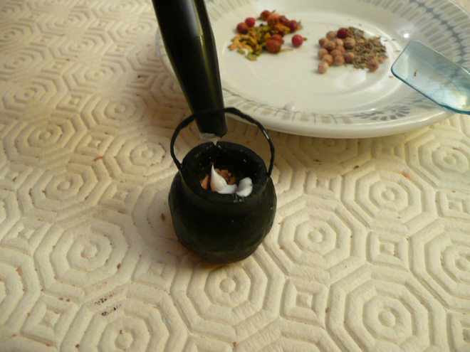 PASO 7: Por último, introducimos dentro del caldero unas gotas de cola blanca de acabado transparente y lo rellenamos con las especias que queramos.