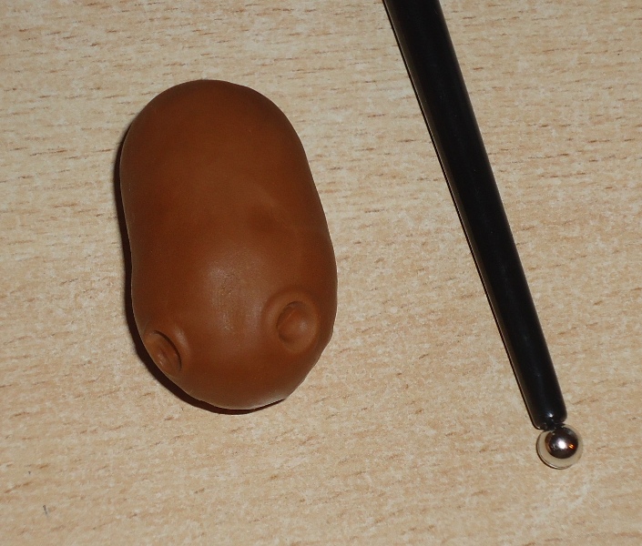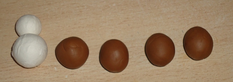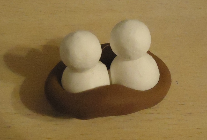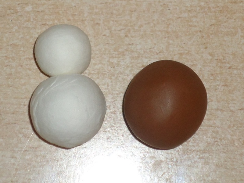 Se hace una bola de porcelana más grande,como más o menos la bolita grande y la pequeña juntas y se hace una pelotita uniforme,ahora hay que forrar las dos de manera que queden separadas sólamente por el lado de las jorobas,intentando hacerlo de forma que no quede aire entre las bolitas y la porcelana.Cuando están forradas se pasa un pañito húmedo y se quitan las imperfecciones o arrugas que se puedan haber quedado.