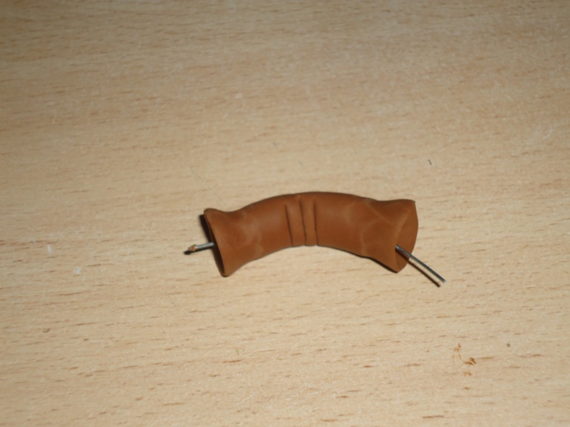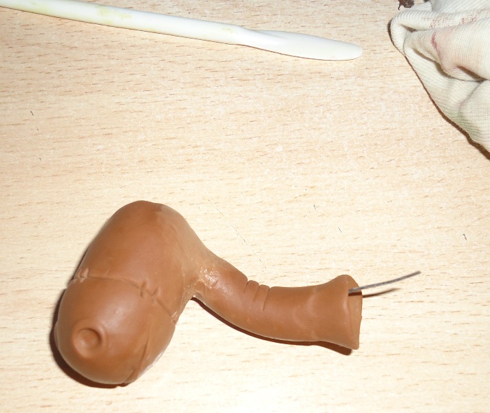 Se hace ahora el cuello,cuando tengamos el cuello hecho se le introduce un trocito de alambre de modo que sobresalga un poco de alambre por cada lado del cuello para poder clavarlo en la cabeza y en el cuerpo cuando se monte toda la figura.Unas arruguitas en el cuello quedan bien,así parecerá que está flexionado.(Guardar también en film transparente)