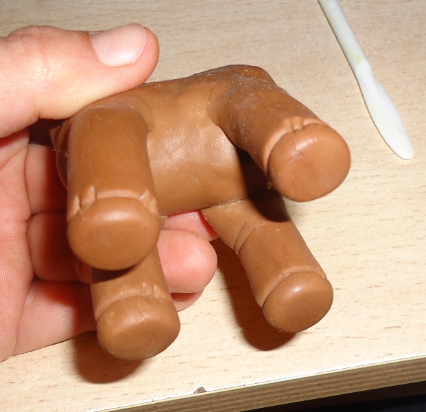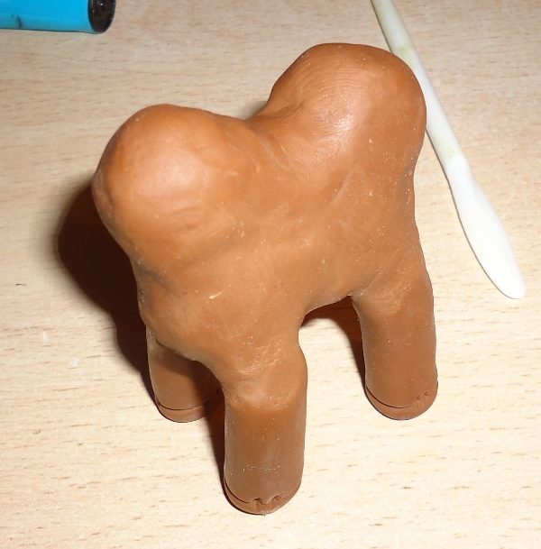 Vamos a ir montando las patas una a una,en el extremo que vamos a pegar,le vamos a hacer la misma forma que si fuese una ventosa,así lo pegaremos más facilmente y se disimulará mucho mejor sin dejar restos de que nuestra figura está montada en distintas partes,(creo que me explico) cuando lo tenemos en forma de ventosa le mojaremos bien tanto el interior como el exterior con el trapo húmedo de forma que se quede la masa bastante húmeda para que se pegue con facilidad al cuerpo,con el mismo trapo húmedo le iremos presionando la pata al cuerpo y lo iremos como estirando para que no se quede feo ni parezcan dos partes,así iremos haciendo con el resto de las piezas,tanto las otras patas como el cuello y la cabeza.Como veréis,yo la cabeza y el cuello los he montado antes y eso es porque me resulta más cómodo luego a la hora de ponerlo junto al cuerpo,tened en cuenta que deberéis dejar la curvatura del cuello antes de ponerlo en el cuerpo ya que luego puede que se os quiebre o se deforme la masa de manera que no se pueda arreglar.