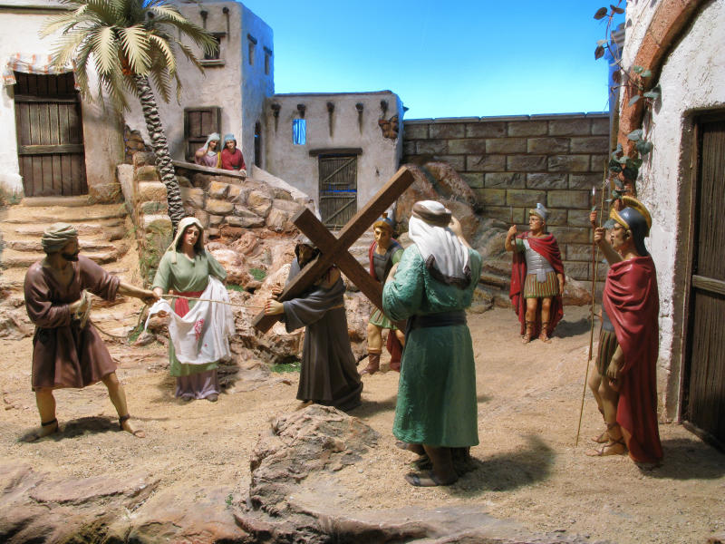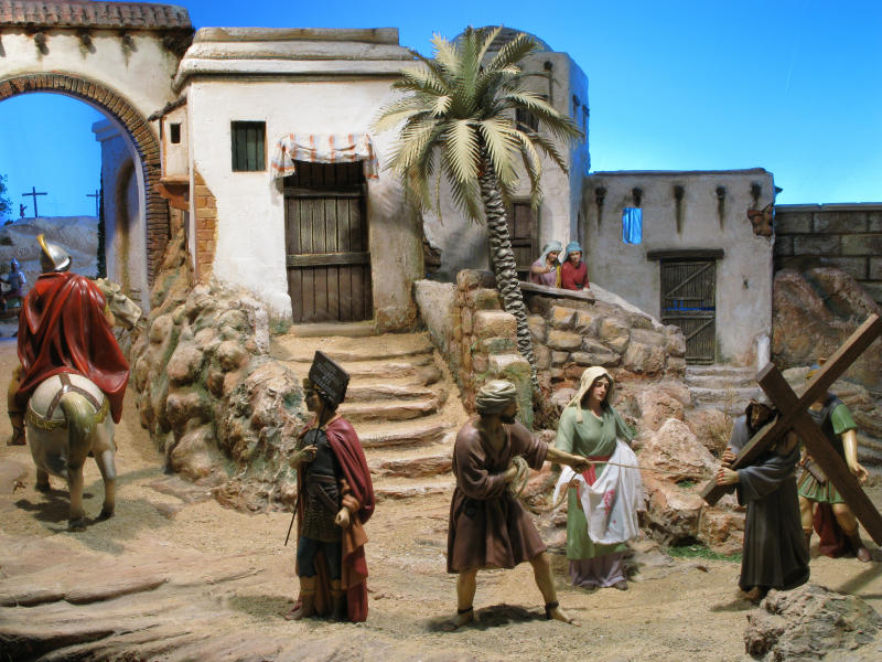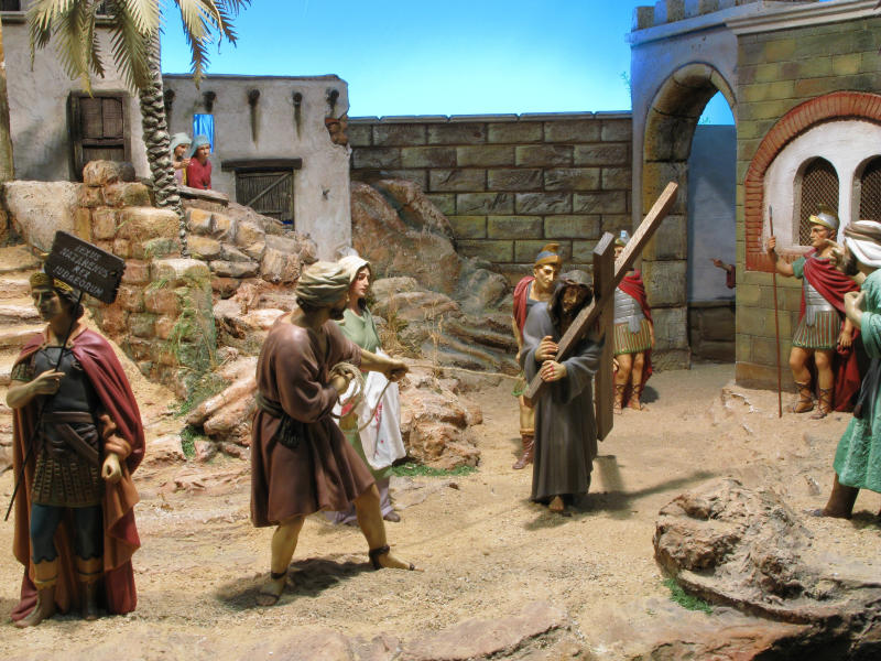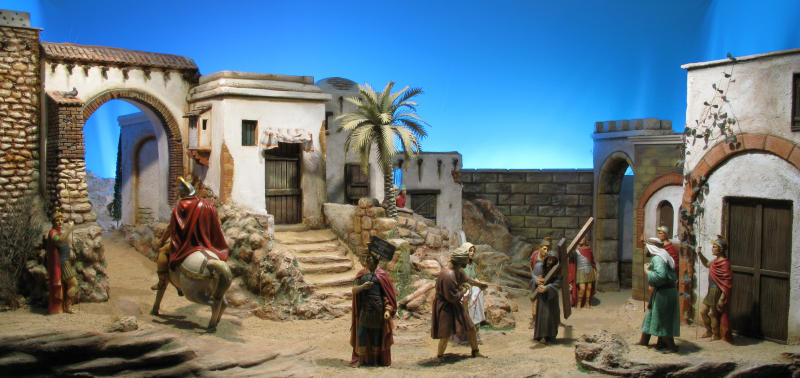 Gran escena del "Camino del Calvario" con figuras de Olot en 30 cm, realizada por Diego Alarcón y Vicente Bañó para la exposición "JESÚS EL CRISTO" de la Asociación de Belenistas de Alicante.