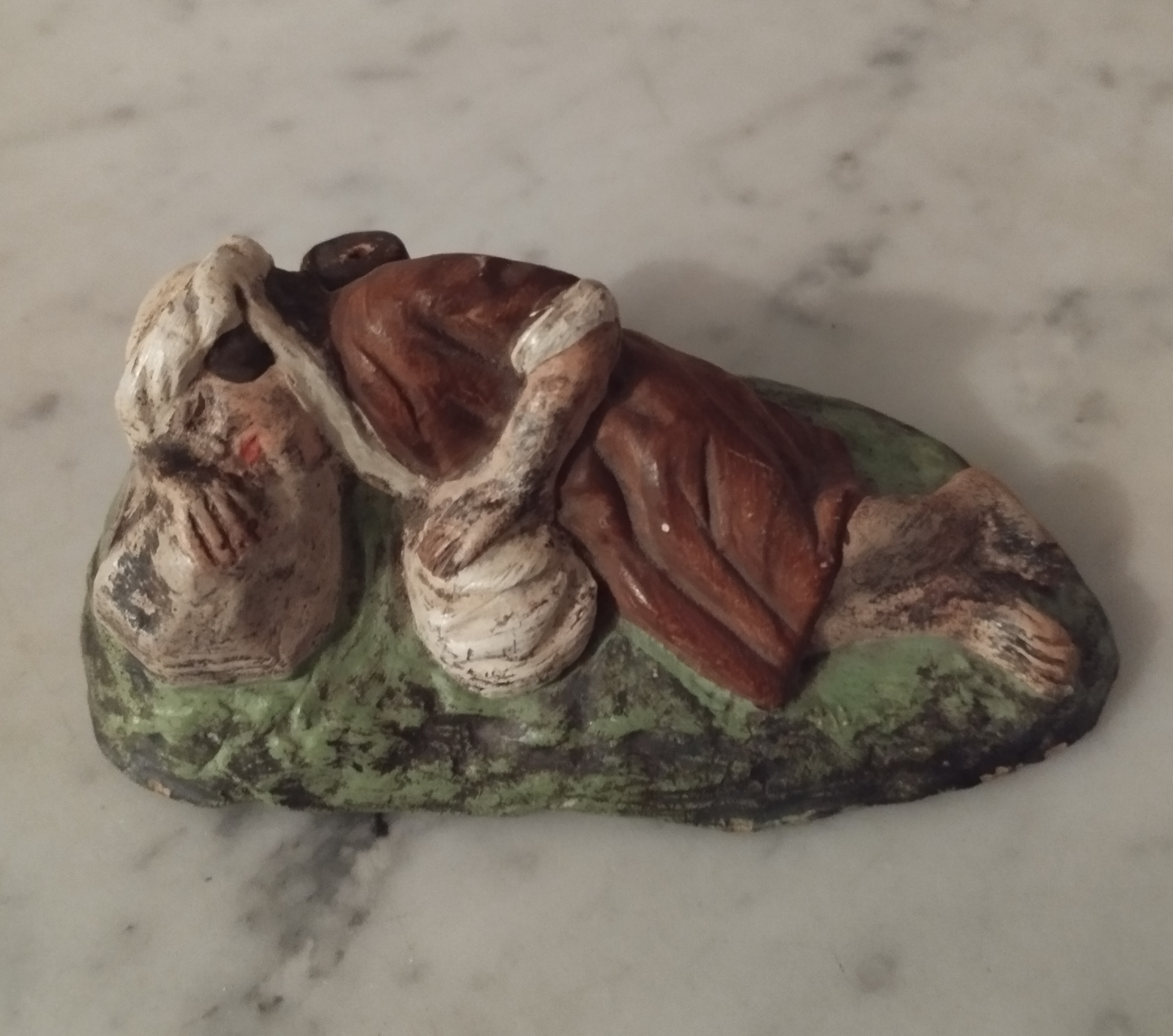 Una nueva figura de Esteve Camps. Se trata de un pastor durmiendo, recostado en una roca, sujetando su bolsa y con un tronco en la parte trasera. Mide 10cm. En este caso no lleva la firma en la espalda, pero es inconfundiblemente de Camps. El turbante, la bolsa, el estilo de ropa y colores es totalmente suyo.