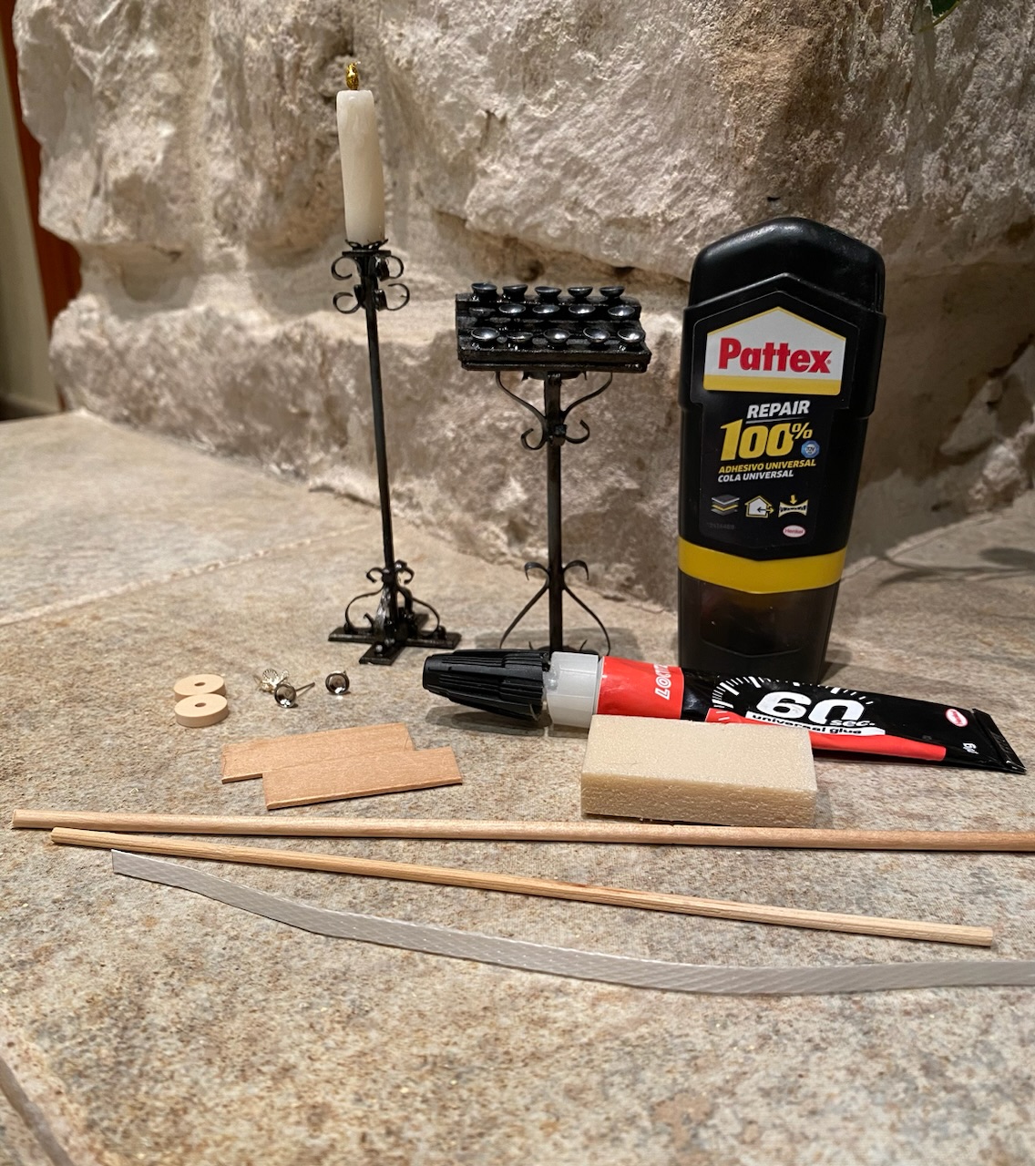 Con la cinta de plástico cortada en tiras y rizándola con unas tijeras se pueden hacer los barrotes de hierro forjado y con los abalorios de metal se pueden hacer los platillos para poner las velas. Se pueden pegar con pegamento fuerte y se pintan con pintura acrílica simulando el color del hierro forjado. Las velitas son de porcelana fría.