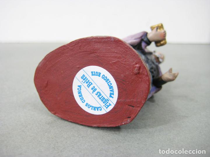 A diferencia cuando pas el tiempo y en el taller tambien esta Francisco Ruiz , la etiqueta ya no es de fondo azul con letras blancas (como las primeras) sino que son blancas , redondas, con letras azules y pone : " CARLOS CUENCA - FIGURAS DE BELEN - FRANCISCO RUIZ
