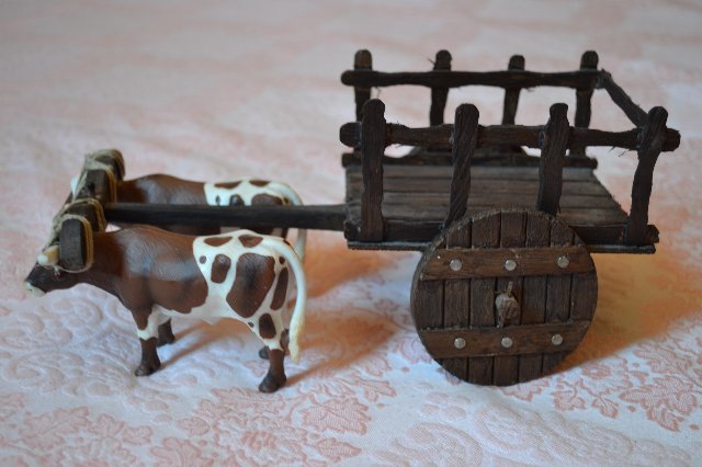 Los bueyes son de Schleich, comprados en un Opencor donde hay unos expositores de animales, alli los vi. Son de 7cm de altura, que es mas o menos la escala que corresponde a las figuras de 12cm, segun la escala de Robé que me imprimi de aqui del foro.