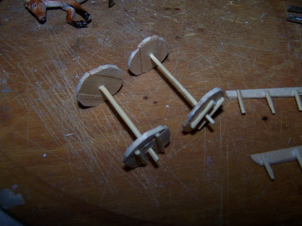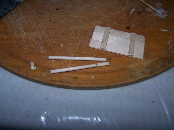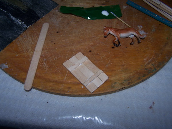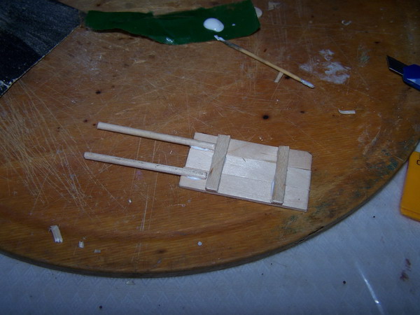 Esta carreta es para figuras de 3 cm. Está completamente hecha en madera, mas precisamente palitos de helado, escarbadientes o palillos, y palitos de brecheta.