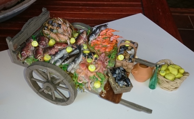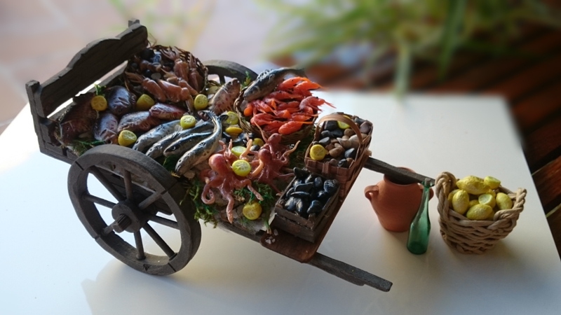 Este carro con pescado en arcilla polimérica es para el belen de este año .