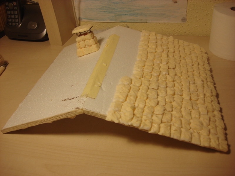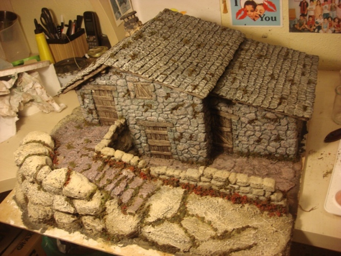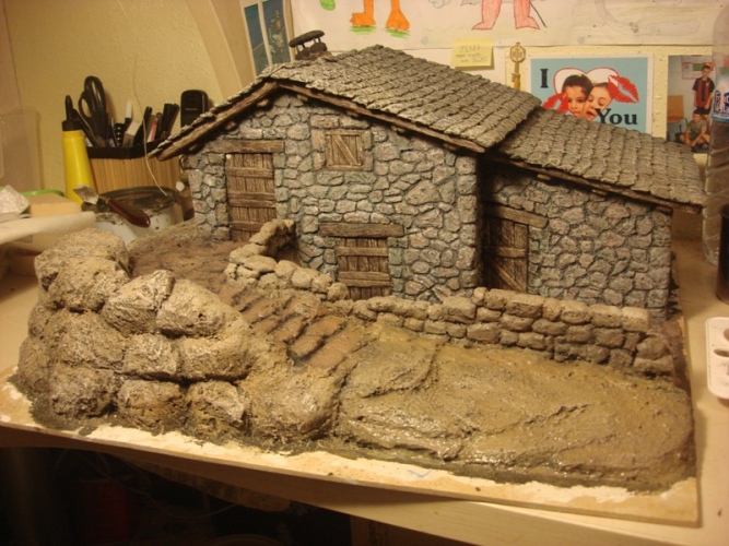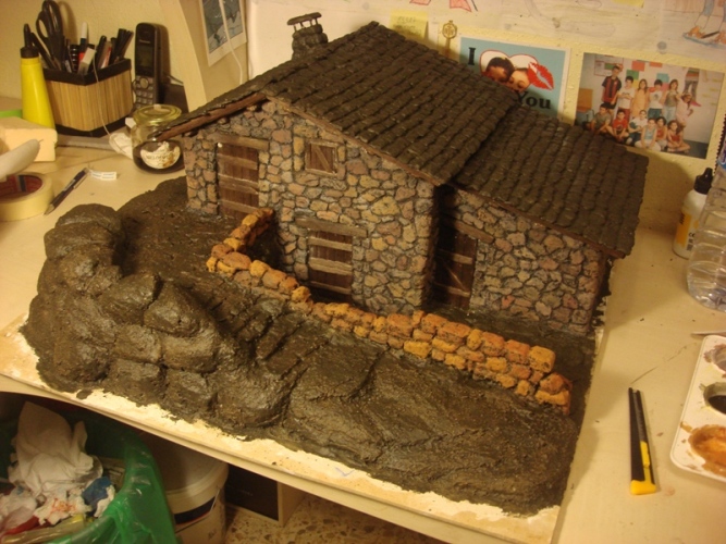 El terreno lo hice con trozos de poliestireno expandido (el de bolitas) pegados con cola blanca, asegurando las uniones, con palillos de pincho, con el soldador y el cúter, fui rebajando hasta llegar a lo que más o menos buscaba. Una pequeña rampa, y unas rocas frente a la casa. El muro de piedras que "acota" el anexo de la casa, está hecho con un trozo de porex extruído, tallado con el cúter. Una vez terminado el tallado del terreno, con porex extruído, hice las losetas del suelo, cortando trozos irregulares, hasta rellenar el camino. A estos trozos no les di textura como a las piezas de pizarra del tejado.