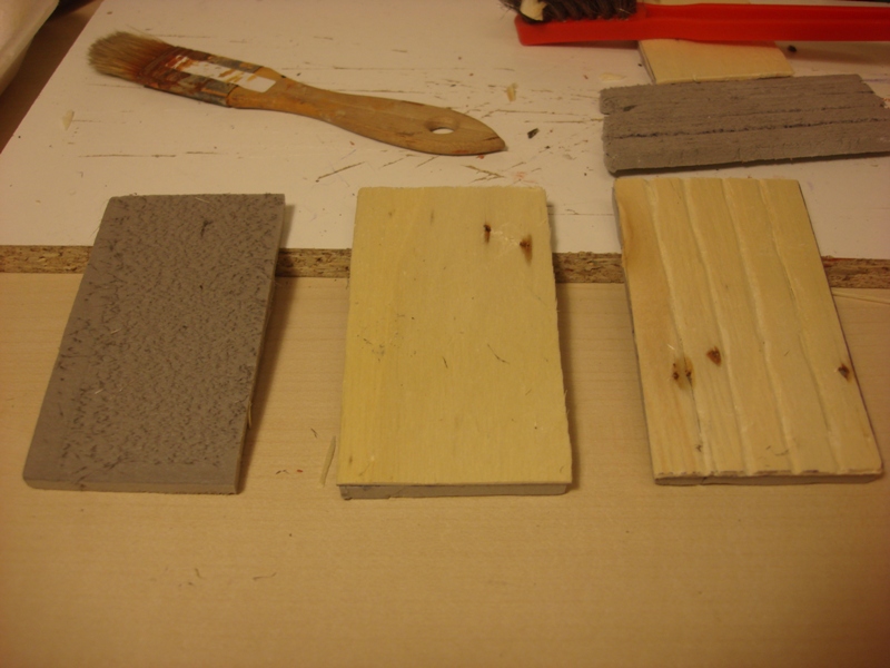 Redondeamos los cantos con el cuter y con un punzón, hago hendiduras imitando las marcas propias de la madera. Hecho esto, le paso el cepillo de alambra enérgicamente, hasta conseguir el efecto que buscamos.