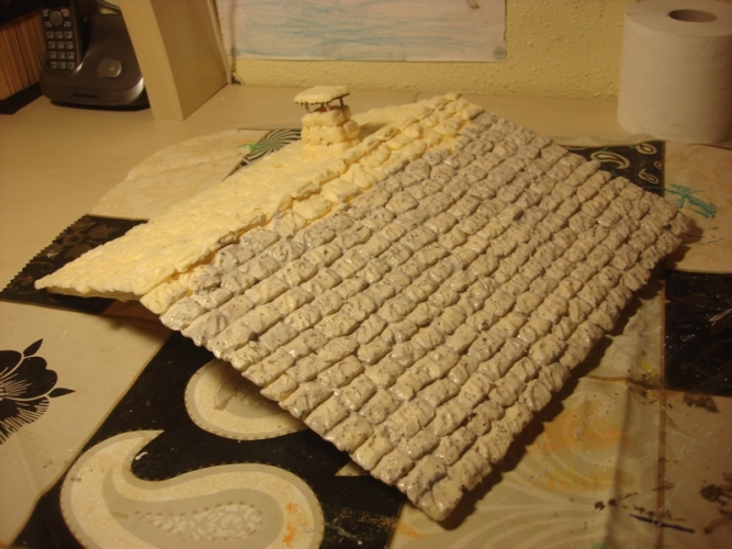 La chimenea también está hecha con poliestireno extruído. Un dato es que está hueca por dentro, por si en un futuro se me ocurriera ponerle una máquina de imitación a humo (vapor de agua).