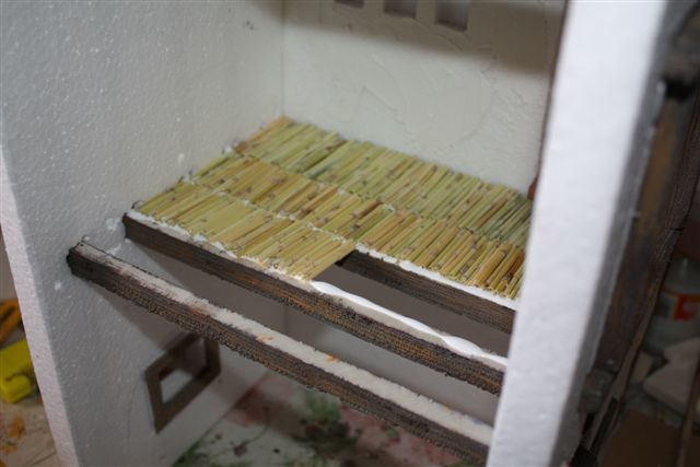 Para hacerle el techo y el suelo del primer piso he pensado en hacerlo como antiguamente se hacía en las casas de mi zona, Alicante, con cañas atadas y una capa de yeso, para eso me he hecho unas vigas de corcho y las he atravesado con idea de más adelante, cuando tenga todas las paredes perfiladas, ponerle cañitas pequeñas y masillar suelo y techo; de manera que visto desde abajo se vean alineadas todas las cañitas entre viga y viga y desde arriba se vea un suelo liso.