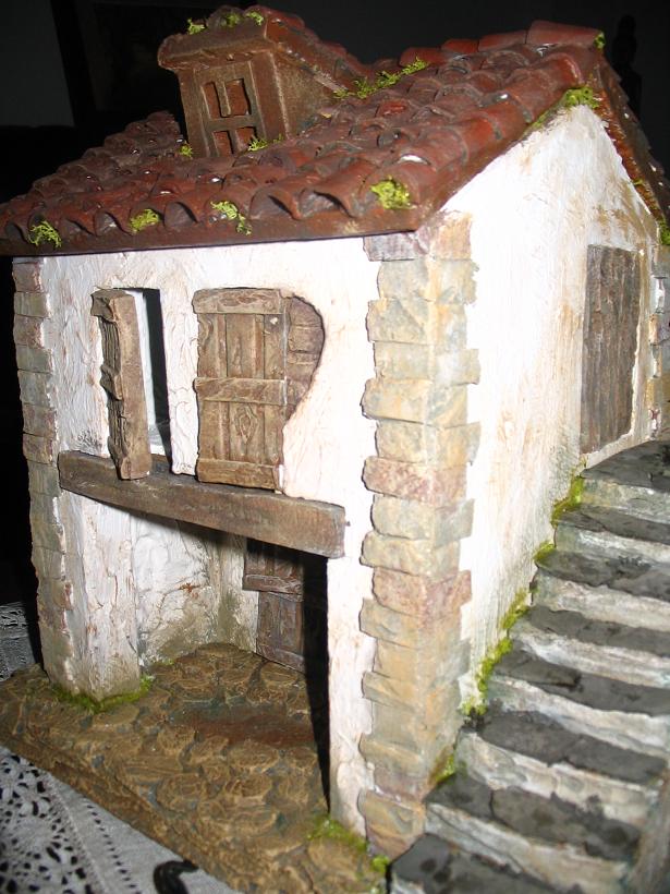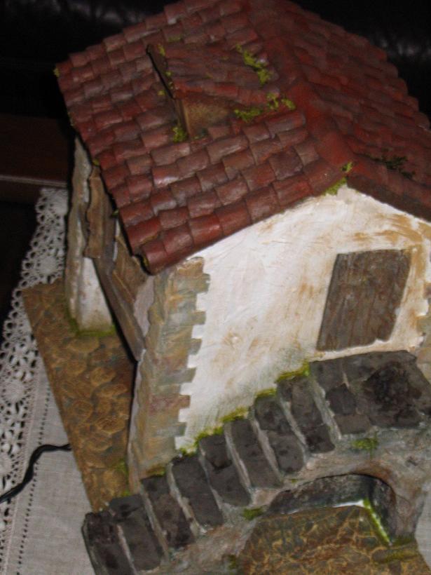 Las tejas, fondo oscuro y mano de arcilla diluida con cola blanca y agua, para garantizar que la arcilla sea duradera, las puertas y ventanas tienen un dibujo bonito pero además yo daría un poco de cepillo de alambre, para sacar relieve, el "desconchao" -espero que no sea familia tuya- jeje, le pondría ladrillo tabiquero acostado del tipo macizo, -ya sabes, de ese que es muy fino- pues queda fenomenal, a estos daría un color terracota mezclado con amarillo oxido o similar.