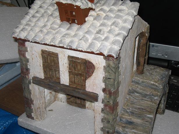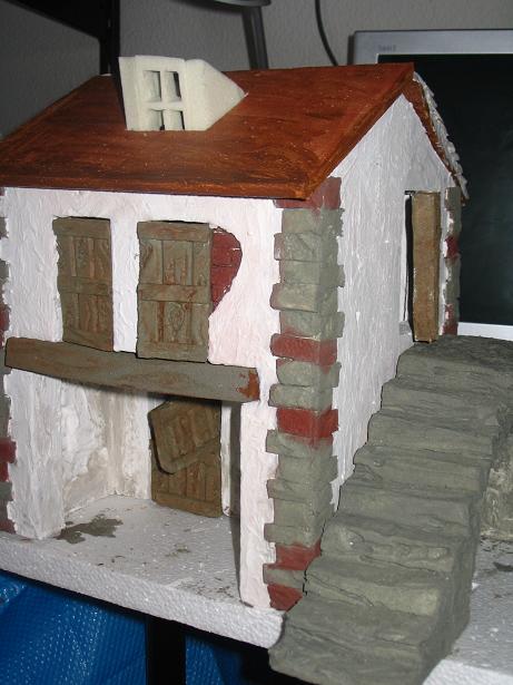 Las tejas, fondo oscuro y mano de arcilla diluida con cola blanca y agua, para garantizar que la arcilla sea duradera, las puertas y ventanas tienen un dibujo bonito pero además yo daría un poco de cepillo de alambre, para sacar relieve, el "desconchao" -espero que no sea familia tuya- jeje, le pondría ladrillo tabiquero acostado del tipo macizo, -ya sabes, de ese que es muy fino- pues queda fenomenal, a estos daría un color terracota mezclado con amarillo oxido o similar.