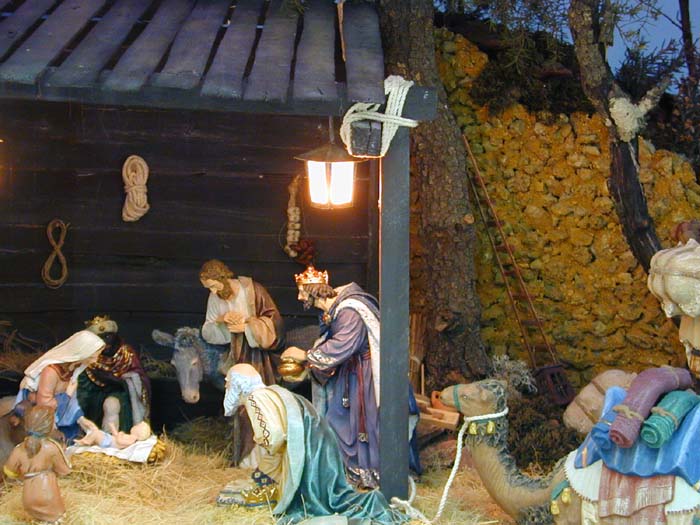 Te adjunto unas fotos del Belén que realizó mi mujer junto a mi suegra. Querían hacer uno que no tuviera nada de corcho o cualquier tipo de material de construcción, todo es natural. Junto a ellas se me ocurrió utilizar maderas, piedras y verde. Ahora, ellas fueron las ártifices de todo lo que ves. El establo está realizado con madera de cajas de frutas pegados sobre otras maderas más consistentes, y bajo mi parecer está bien. Fijate en el detalle de la luz entrando entrando por las tablas.