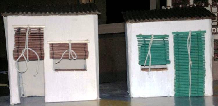 Las casitas (anticrisis) que pongo a continuación las hicimos hace varios años, los ingredientes son:carton, las puertas y ventanas estan hehas con badejas de las que vienen con la carne y las persianas con con palillos, pegamento, hilo, alambre y pintura.
