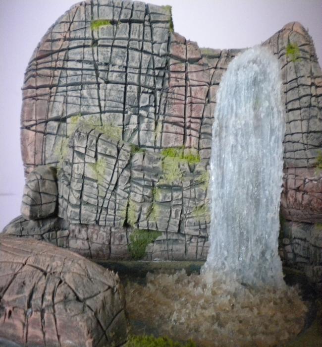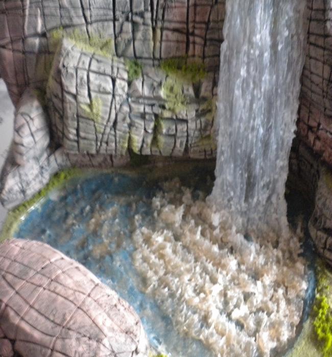 Deciros, pues no se aprecia en la imagen que todo el perímetro del estanque esta rebajado, son tres laminas de medio centimetro de porex. La primera del fondo como base del estanque y las dos siguientes recortadas las siluetas para dar profundidad y cabida al agua artificial.