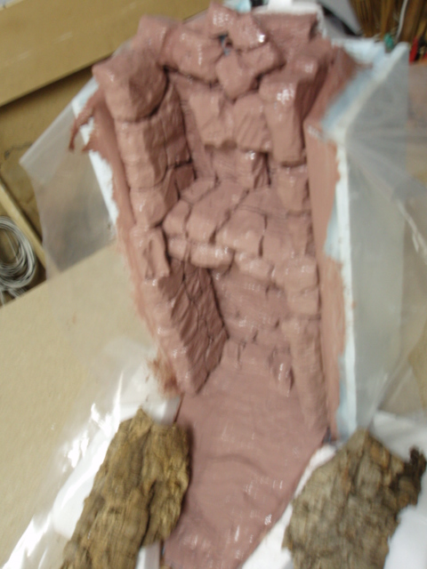 la cascada esta realizada con porex de 3cm es el armazon y despues forrado con plastico manejable eso si con mucho cuidado para no hacer agujeros y posibles fugas de agua... vereis que despues se forra por encima del plastico otra vez porex con forma de rocas y saltos por donde pasara el agua una vez terminada se empieza a pintar primer paso un color de cubrimiento total y despues realizaremos unas cuantas veladuras de diferentes colores asta realizar el final con el blanco....por ultimo recubriremos todo el paso del agua con silicona transparente la de baños para que el agua transcurra sin tocar porex ni pintura....