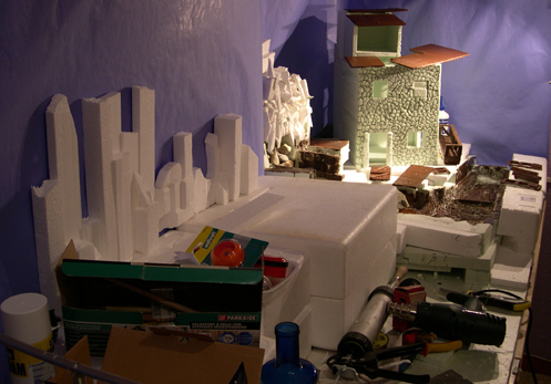 Montañas terminadas toda la madera de la casa y preparada para dar las primeras veladuras mañana, junto con la primera capa en las montañas, en la casa y aprovechar la pintura para darle un poco de verde al río.