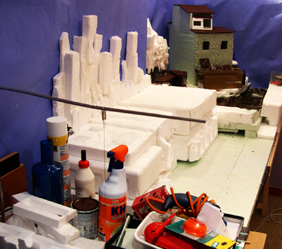 En el KH7 tengo agua con cola blanca, para ir poniendo papel y mojarlo se va adaptando, así se da un poco de forma a las montañas y no quedan tanto las aristas de los pegotes de porex, quedando cuando se seca duro para poder pintar, no deja de ser "papel mache", parece organizado, por que recorto la foto si no es para salir corriendo.