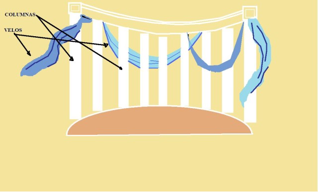 Estaba pensando en un solado de color barro, pero me decanto finalmente por unos velos de los que decía Garteo, entre las columnas y en tonos azules, para dar un poco de contraste cromático al conjunto.