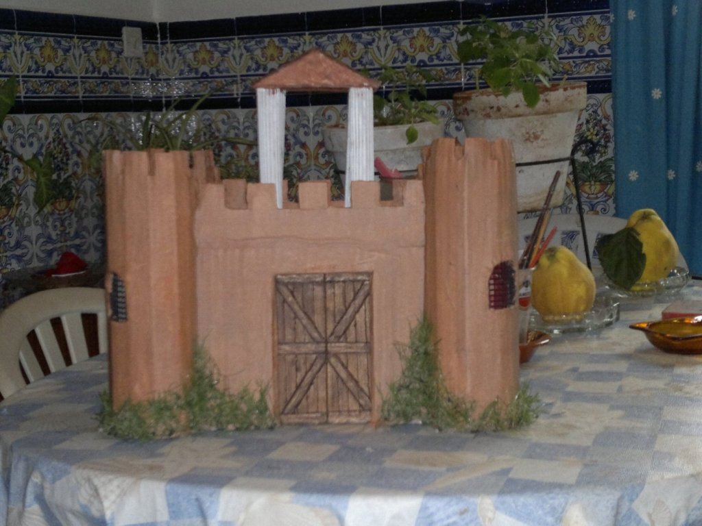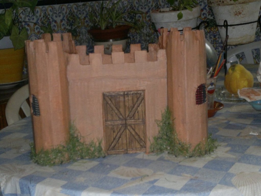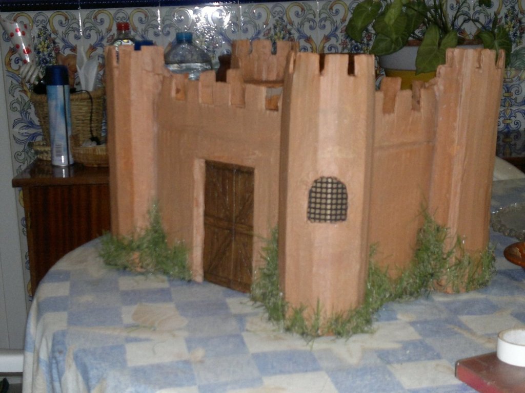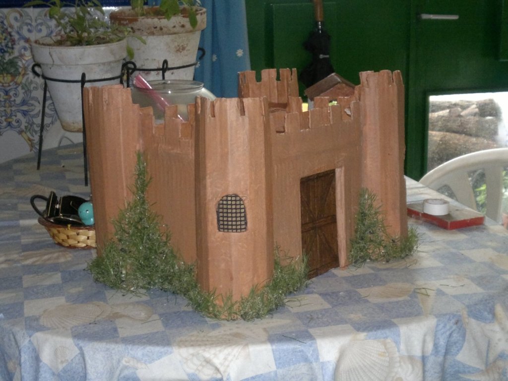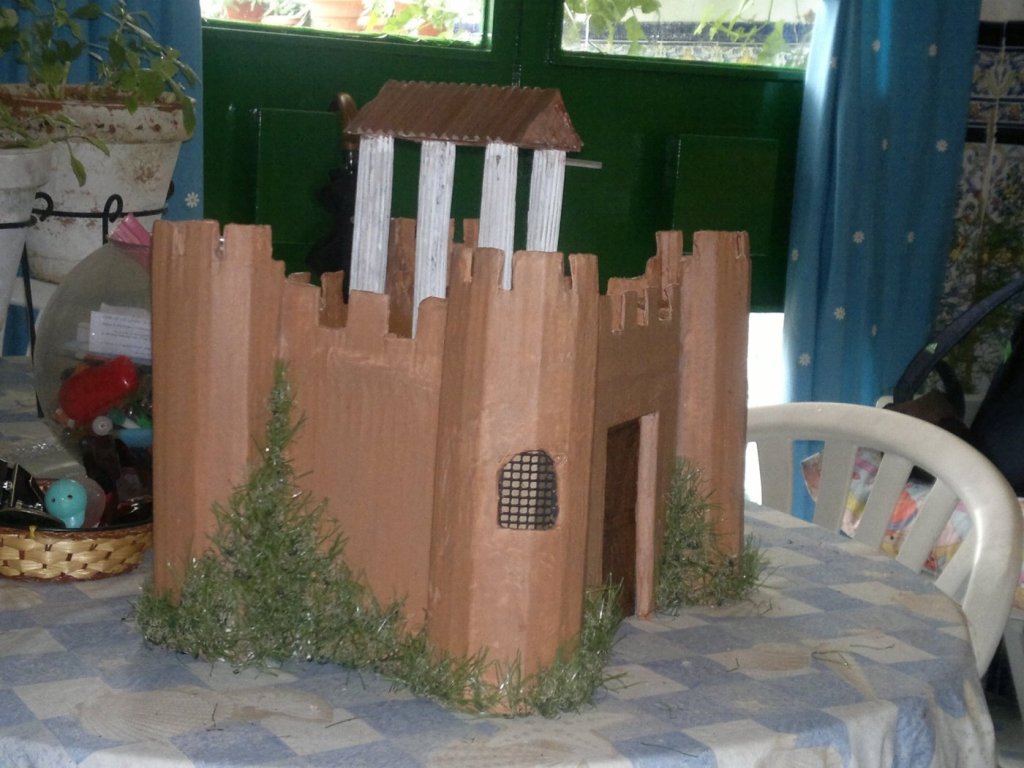 este castillo esta hecho con una caja de carton, rejillas de unos altavoces, restos de cesped artificial, pintado con arcilla y luego una capa de cola. La parte de arriba no se si quitarsela ¿que opinais?