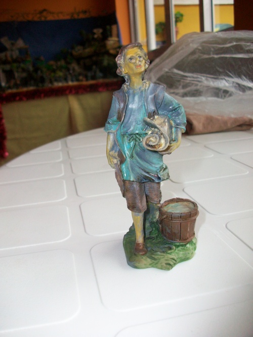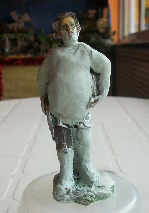 -Como no lo veía integrado en el papel de posadero y a pesar de haber guardado ya todas las herramientas y cachibaches que desde hace dos meses he utilizado para el belén,esta tarde me decidí a aplicarle un cambio radical con la esperanza de poder acabar el proceso antes de que lleguen los viajeros. Así pues, en las siguientes fotos veréis un resumen del proceso -despiece para la eliminación de elementos sobrantes, reconstrucción, añadido de volumen (será algo orondo) con pasta de modelar y..........ahí quedó de momento hasta que se seque y pase a entelado y pintura.