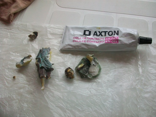 -Como no lo veía integrado en el papel de posadero y a pesar de haber guardado ya todas las herramientas y cachibaches que desde hace dos meses he utilizado para el belén,esta tarde me decidí a aplicarle un cambio radical con la esperanza de poder acabar el proceso antes de que lleguen los viajeros. Así pues, en las siguientes fotos veréis un resumen del proceso -despiece para la eliminación de elementos sobrantes, reconstrucción, añadido de volumen (será algo orondo) con pasta de modelar y..........ahí quedó de momento hasta que se seque y pase a entelado y pintura.