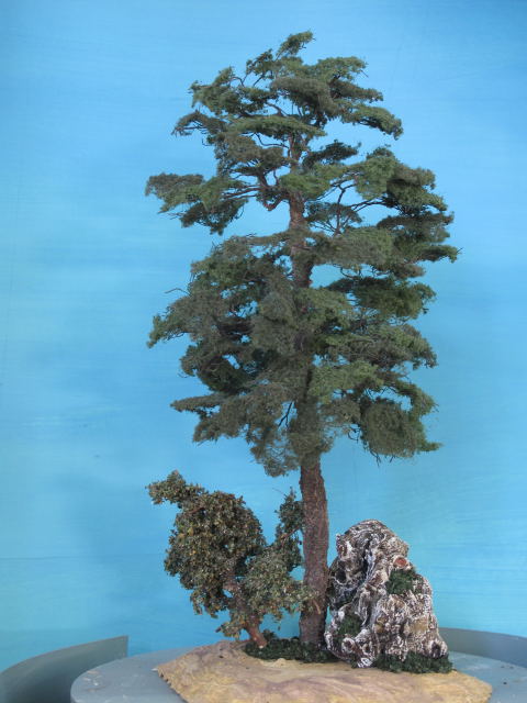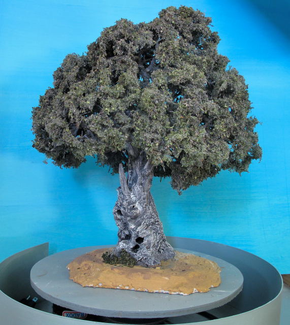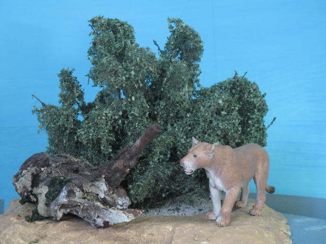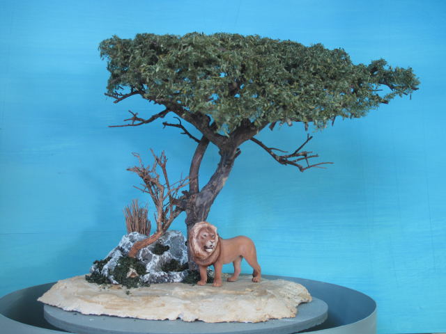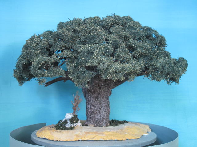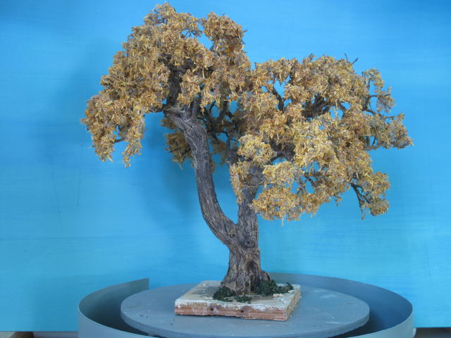 El follaje de los árboles lejanos lo hago con aserrín teñido en diferentes tonos de verde, los más cercanos con pequeños pedacitos de tela.