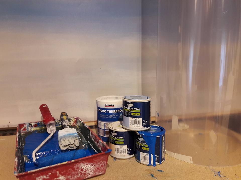Para pintarlo he utilizado una imprimación universal y luego con colores, en este caso con base de poliuretano, aunque vale cualquier tipo de pintura, en tonos: azul luminoso, azul cielo y arena (todos al agua).