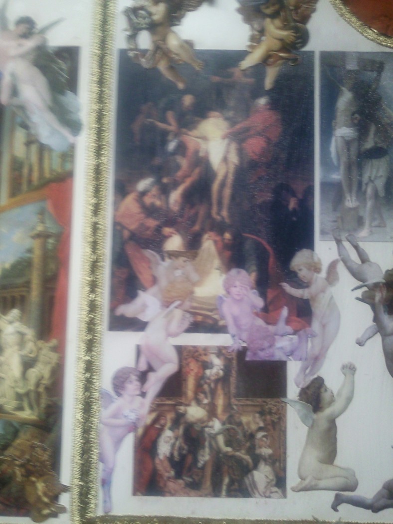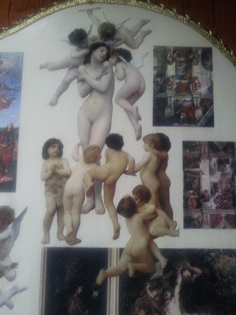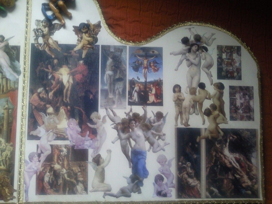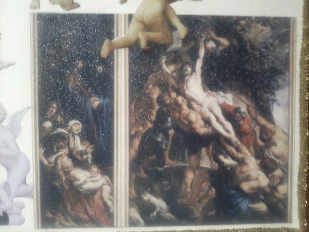 David, te ha quedado precioso y muy,muy original, sobre todo la parte central, quizás porque las fotos se ven más claras, me gusta porque tienes varias pinturas barrocas muy conocidas y a mi el arte renacentista y sobre todo barroco me entusiasma,muy buen trabajo, quizás yo habría hecho los angelitos algo más claros, imitando porcelana, yo los tengo muy parecidos, porque así se integrarían mejor con el conjunto, que en las fotos se ve mucho más claro, pero puede ser que las fotos los haga más oscuros de lo que realmente son o el betún de judea que oscurece mucho las figuras. Enhorabuena. Saludos