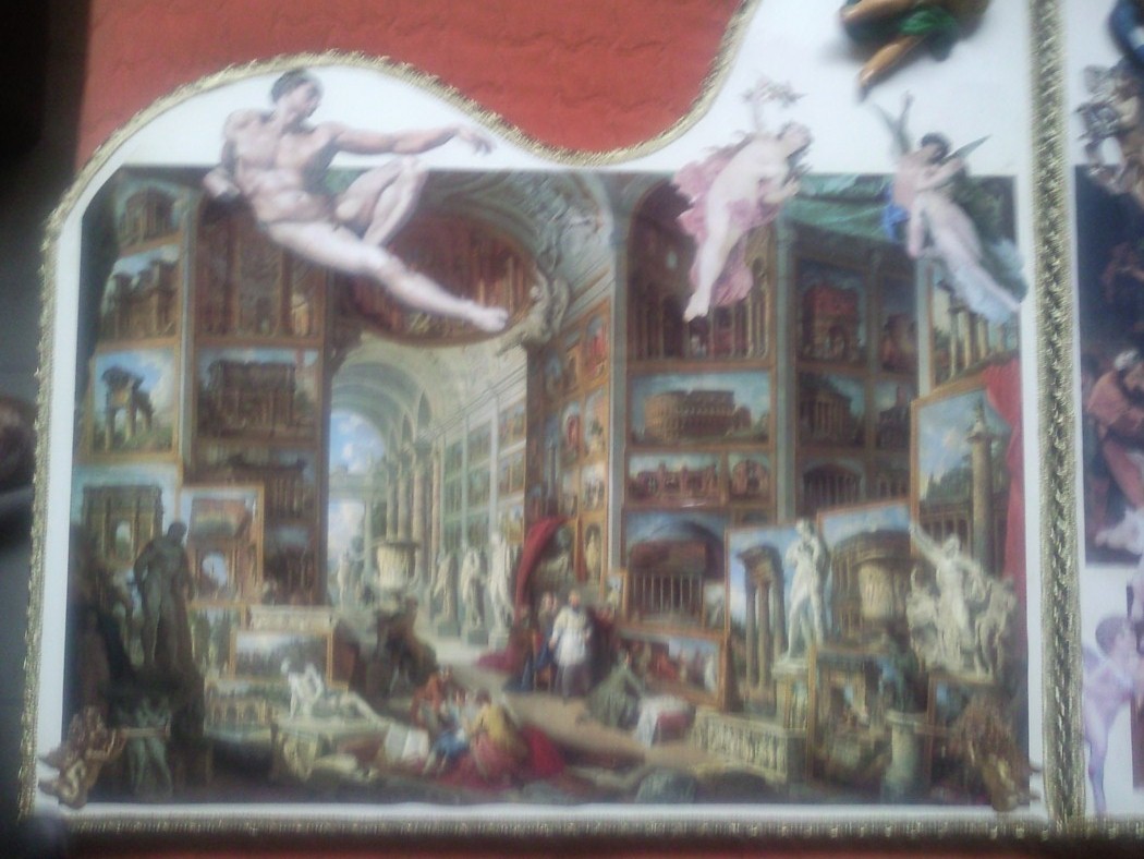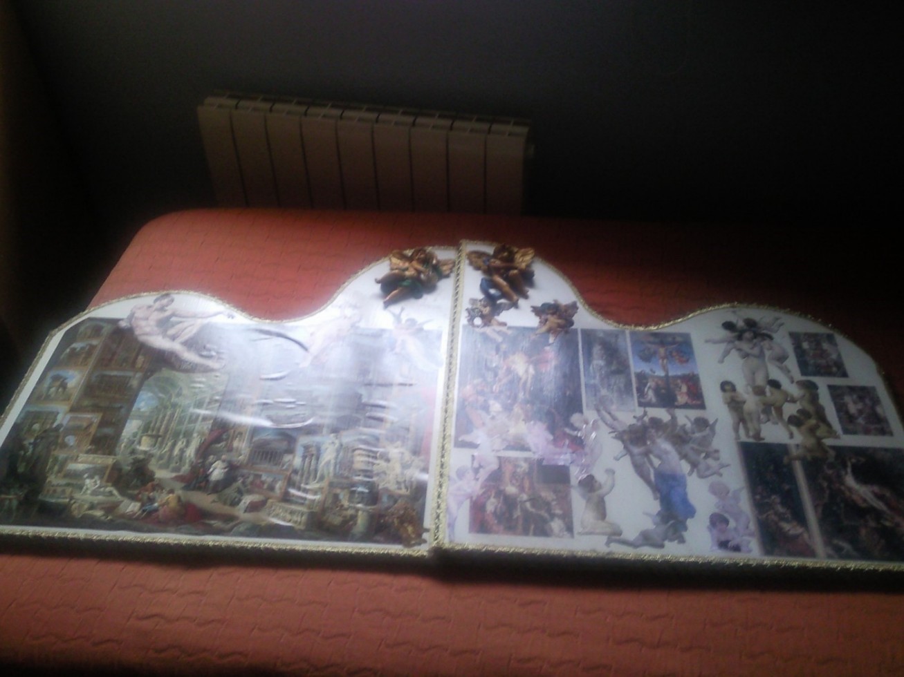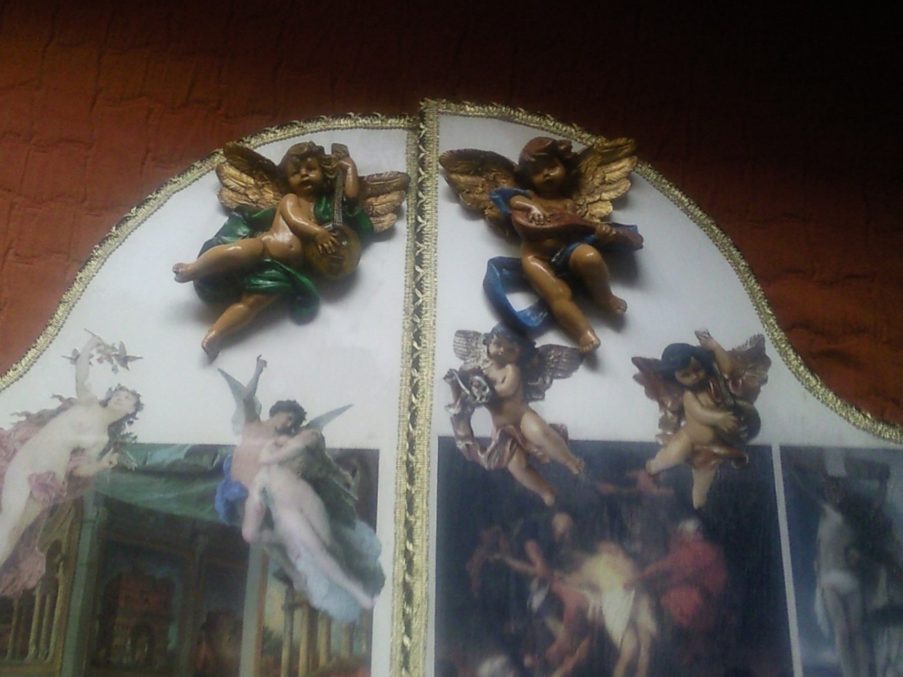 David, te ha quedado precioso y muy,muy original, sobre todo la parte central, quizás porque las fotos se ven más claras, me gusta porque tienes varias pinturas barrocas muy conocidas y a mi el arte renacentista y sobre todo barroco me entusiasma,muy buen trabajo, quizás yo habría hecho los angelitos algo más claros, imitando porcelana, yo los tengo muy parecidos, porque así se integrarían mejor con el conjunto, que en las fotos se ve mucho más claro, pero puede ser que las fotos los haga más oscuros de lo que realmente son o el betún de judea que oscurece mucho las figuras. Enhorabuena. Saludos