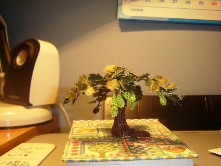 Hola a todos. Aquí os pongo una vid o cepa que he hecho con papel, alambre y pasta Das. Aún no está terminada del todo pero antes de darle el último toque necesito que me deis vuestra opinión sobre si necesitaría más hojas o más uvas, si el color de las uvas debería ser éste o morado .... Lo que veais conveniente. Gracias de antemano.