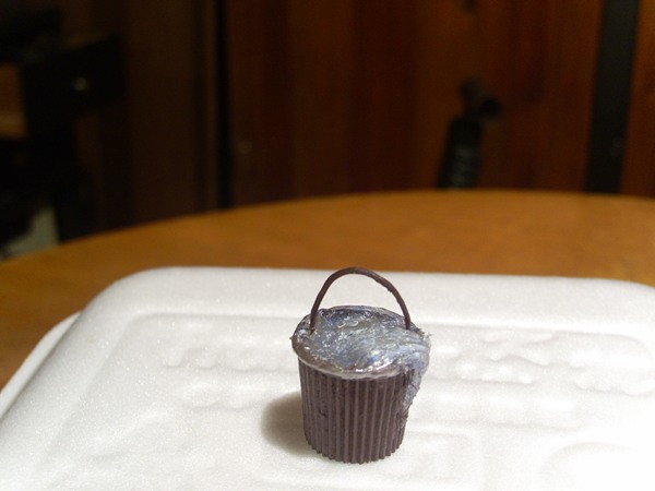 Les cuento, el pequeño balde esta relleno de silicona industrial, (o sea, la fria), que después de dejarla secar le dimos unos toques de celeste claro y en las puntitas que quedaron levantadas unos pequeños salpicones de blanco sucio.