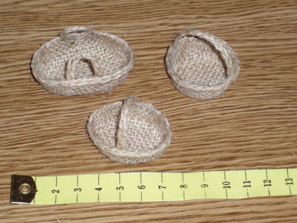 Buscamos objetos que nos puedan servir como molde para el fondo de las cestas que vamos a hacer, eligiendo con cuidado las medidas, cualquier cosa sirve.Necesitaremos unas hebras de la tela para hacer una trenza con la que formaremos el borde y las asas de las cestas, el número de hebras a utilizar depende de cómo nos guste la trenza, yo en este caso he utilizado 6.