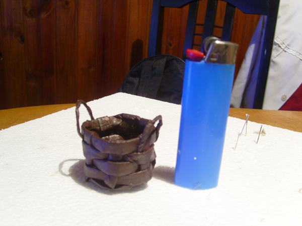 Hola chicos, esa canasta ha quedado muy bien tiene apariencia de tejido de palma y se vé fácil de hacer, solo tengo 2 dudas. Endurece con el pegamento? y cuánto mide? hizo falta el encendedor jaja