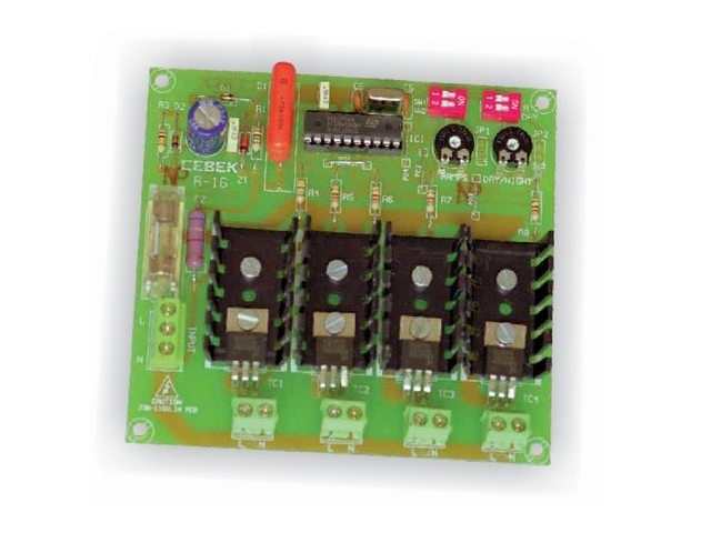 Información R-16 Automatismo profesional para efectos “Anochecer” y “amanecer”. Realiza automáticamente la simulación del cambio del día a la noche, con los efectos intermedios del amanecer y el anochecer. Ejecuta todo el proceso cíclicamente y admite control de temporización tanto en el “día” como en la ”noche”. Incorpora salidas exclusivas para cada ciclo:“día-amanecer” y “anochecer-noche”. Incluye tambien salidas independientes funcionando una a nivel fijo mientras se produce el “día”, y otra cuando se este produciendo la “noche”. Especialmente indicado en grandes Belenes, modelismo, etc. No admite cargas inductivas tales como lámparas PL, relés, etc.