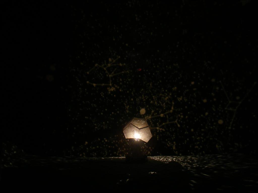 La última consideración es la de la pantalla: esto proyectaría un cielo perfecto sobre una bóveda hemiesférica, pero por desgracia la mayoría de las casas  tienen los techos y paredes planos, no esféricos... esto significa que  la parte de pared/ pantalla más cercana a la lámpara tendrá estrellas "gordas" mientras que la parte de pared má alejada de la lámpara tendrá estrellas pequeñitas.