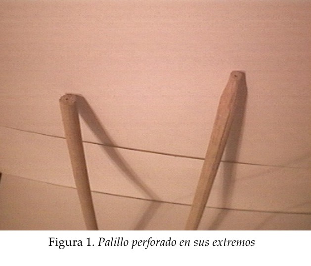 1) En el centro de cada extremo del palillo o vara realizamos una perforación con el taladro. La una será para fijarlo a la base con la puntilla sin cabeza (y así evitarnos el resquebrajamiento accidental de la vara); y la otra, para clavar allí lo que será la punta del ciprés. [Fig. 1]
