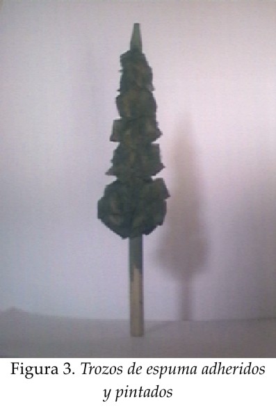 4) Usando silicona líquida (la cola blanca no sirve aquí)cubrimos la vara de madera con los trozos de espuma de modo que siga la característica forma de lanza del ciprés pero sin exagerar en la uniformidad ni simetría. Ese, creo yo, es el secreto del realismo en esta clase de trabajos. Pulimos, claro está, cualquier rebaba que se salga de la forma imaginaria de lanza, con las tijeras.