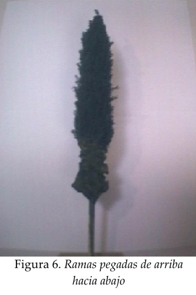 c) Debe evitarse, como ya dijimos, la excesiva uniformidad, para ello, aunuqe siempre respetaremos la verticalidad de cada rama, dispondremos algunas un poco divergentes de modo que sobresalgan de entre las demás [ver Fig. 6].