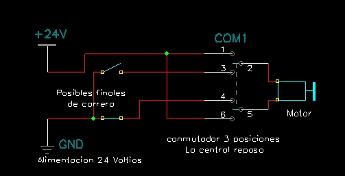 Tener en cuenta que la tensión aplicada sera la del funcionamiento del motor, en este caso es un esquema que tenia para un motor de 24 Voltios, se trata de ver los contactos del conmutador como si fueran los contactos del rele.
