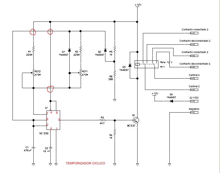 Este circuito es un temporizador ciclico, los tiempos se pueden regular a voluntad, entre 1 y 5 minutos aproximadamente, solo debemos regular los ajustables a nuestro gusto.