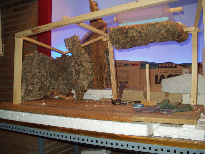 Josefo (por cierto ¿el nombre es por Flavio Josefo o por llamarte José?), los corchos se montan sobre un armazón de madera o apoyados en una plancha de fondo, o atornillados a la base de madera. Se utiliza cuadradillo de madera de 30 x 30 y menores, con el que se hace una estructura sencilla atornillada entre sí, prevía perforación pordónde vayas a poner tornillos para que no es "abra" al atornillar (por si quieres hacerlo, este es el mayor problema). Es como si hicieras el volumen de la montaña con patas y travesaños superiores, como caballetes. Sobre esta estructura se atornillan los corchos. No tengo una foto a mano, pero procuraré buscarla y publicarla.
