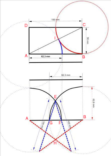 Partiendo del rectángulo ABCD (en el esquema adjunto de 100 mm. x 50 mm.)… realizaremos con el compás una circunferencia con centro C y radio BC… uniendo los vertices A y C obtenemos el punto I resultante de la intersección del segmento AC y la circunferencia con centro C realizada.