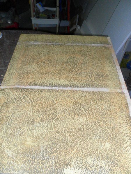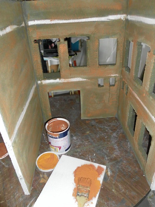 Tenemos ya pintado el interior de verde oscuro (1)(2), una vez seco se comienza a pintar, como al final quedara lo mas blanco posible y a penas se vera el interior, (osea el fondo del escayolado), nos saltamos unos pasos y comenzamos con mitad rojo oscuro, y mitad albero (3)(4), de este es mejor dar dos veces a pincel seco, ya que el verde oscuro absorbe la primera capa y se pierde. Una vez seca (que si no es una superficie grande, que de una mano a otra de tiempo a secar, es mejor esperar para que quede bien la definicion de los barridos, y si no se mezclaran. Cuando se sabe que se esta mezclando, es cuando se empieza a poner rosa, o de un color que no es el que tu estas utilizando). Acontinuacion se hecha un poco mas de albero, y se da otra mano (siempre a pincel saco) (5)(6), a continuacion un poco mas de albero (7)(8), la proxima se da albero solo (9)(10), a continuacion se le hecha al albero, blanco, pero poco, y se le da una mano (11)(12), luego se le hecha la mitad de albero y la mitad de blanco (13)(14), ahora algo mas de blanco y se le da una mano (15)(16), luego casi blanco (17)(18), en esta ocasion, solo blanco, pero con el color que queda en la brocha, se le da, pero algo mas cargado que a pincel seco, manchando algo mas de lo normal, para darle cuerpo al blanco que deve quedar (19)(20), a continuacion hacemos lo mismo, solo blanco, y con el color que tiene la brocha, pero dejando la brocha mas cargada, no en esceso, y con cuidado vamos rellenando muchos de los huecos que forma el escayolado, que aun no habia sido relleno, o se relleno con otro color (21)(22), en esta ocasion lo mismo, pero dandola cantidad de pintura suficiente para que quede todo "CASI" blanco, dando una mano de blanco en pincel semiseco, entreteniendote en dejar solo algo de lo oscuro, sea verde oscuro o de otro color, para que luego desde fuera se vea el contraste y las sombras del escayolado (23)(24).