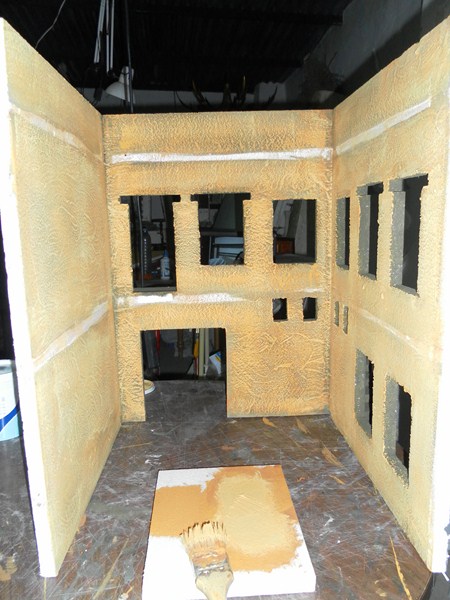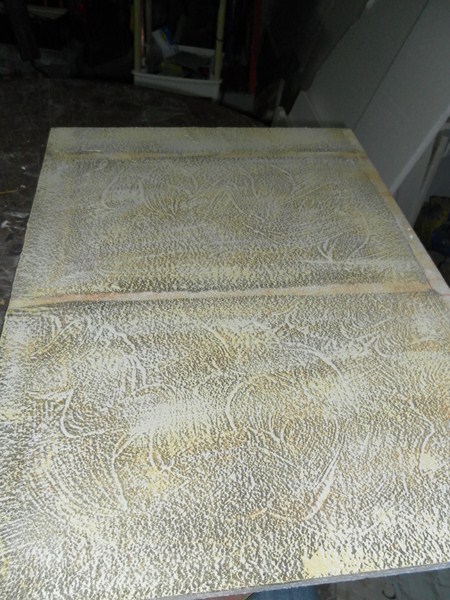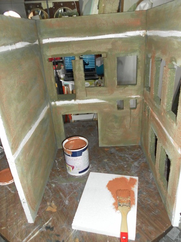 Tenemos ya pintado el interior de verde oscuro (1)(2), una vez seco se comienza a pintar, como al final quedara lo mas blanco posible y a penas se vera el interior, (osea el fondo del escayolado), nos saltamos unos pasos y comenzamos con mitad rojo oscuro, y mitad albero (3)(4), de este es mejor dar dos veces a pincel seco, ya que el verde oscuro absorbe la primera capa y se pierde. Una vez seca (que si no es una superficie grande, que de una mano a otra de tiempo a secar, es mejor esperar para que quede bien la definicion de los barridos, y si no se mezclaran. Cuando se sabe que se esta mezclando, es cuando se empieza a poner rosa, o de un color que no es el que tu estas utilizando). Acontinuacion se hecha un poco mas de albero, y se da otra mano (siempre a pincel saco) (5)(6), a continuacion un poco mas de albero (7)(8), la proxima se da albero solo (9)(10), a continuacion se le hecha al albero, blanco, pero poco, y se le da una mano (11)(12), luego se le hecha la mitad de albero y la mitad de blanco (13)(14), ahora algo mas de blanco y se le da una mano (15)(16), luego casi blanco (17)(18), en esta ocasion, solo blanco, pero con el color que queda en la brocha, se le da, pero algo mas cargado que a pincel seco, manchando algo mas de lo normal, para darle cuerpo al blanco que deve quedar (19)(20), a continuacion hacemos lo mismo, solo blanco, y con el color que tiene la brocha, pero dejando la brocha mas cargada, no en esceso, y con cuidado vamos rellenando muchos de los huecos que forma el escayolado, que aun no habia sido relleno, o se relleno con otro color (21)(22), en esta ocasion lo mismo, pero dandola cantidad de pintura suficiente para que quede todo "CASI" blanco, dando una mano de blanco en pincel semiseco, entreteniendote en dejar solo algo de lo oscuro, sea verde oscuro o de otro color, para que luego desde fuera se vea el contraste y las sombras del escayolado (23)(24).