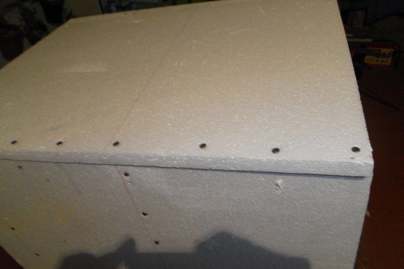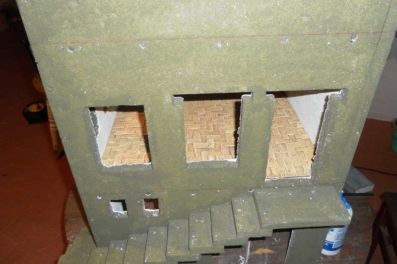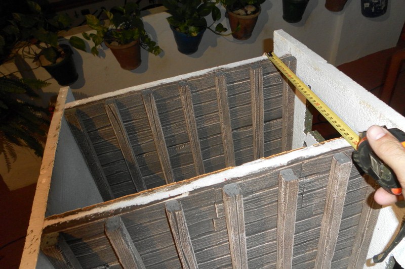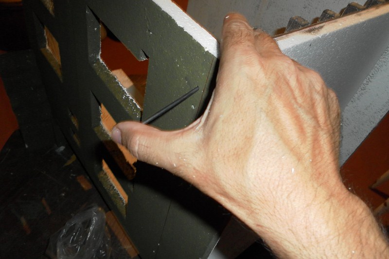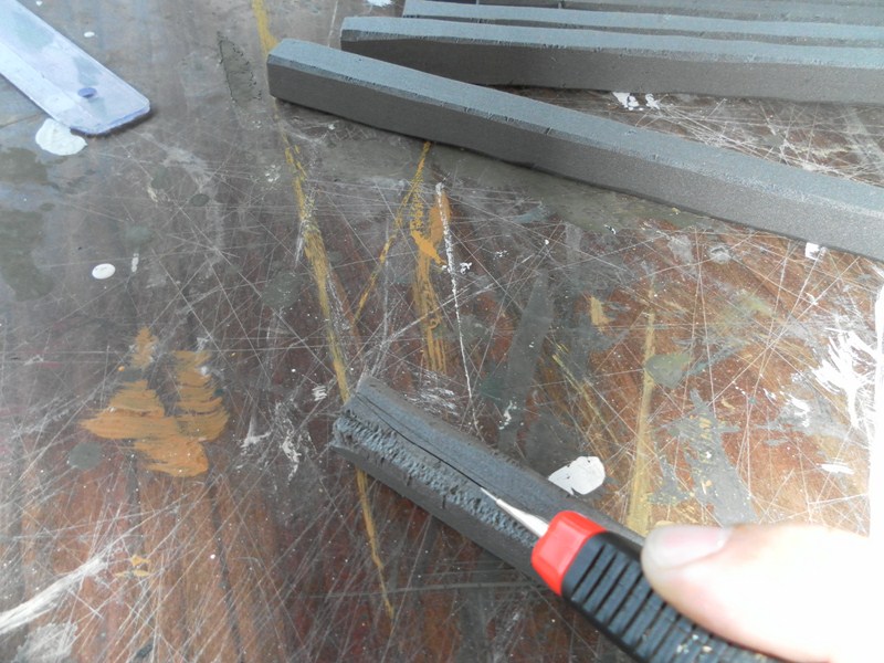 Una ver terminado el suelo, bamos a terminar los techos. En un perex estruido (del mas denso, que no tiene bolitas), se marcan tiras de dos cm. (1), se marca para secar 14 tiras, y se van cortando las tiras (2). Una vez cortada y como la anchura del porex es de 3 cm., bamos a marcar para sacar tiras cuadradas de 2 X 2 cm. (3). Para cortarlas, ponemos la tiras tendidas una al lado de la otra, para poder apoyar la regla y que salga el corte recto (4)(5), una vez cortada, presentamos, en principio cinco tiras (6), y luego siete tiras (7), para ver cual queda mejor. Marcamos el centro, luego marcaremos donde va las otra tiras (8). Como la anchura del techo es de 45 cm., marcamos las tiras cuadradas a 45 cm. (9), y se cortan (10). Con el cuter se van quitando todos los filos (11), y a algunos se le saca unas grietas en forma de V (12)(13)(14).