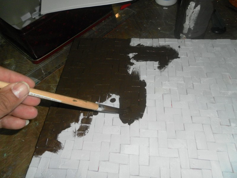 Una vez terminado el suelo y despues de que seque bien el pegamento (1), se le pasa una lija fina (2), no muy fuerte ni tampoco muy intenso, solo para matar los cantos mas sobresalientes, no queremos un suelo perfecto. Despues de limpiarlo bien con una brocha o una aspiradora, se pinta de marron oscuro (3)(4), lo pinto de marron oscuro por que es un interior, y se veria la suciedad, los exteriores los pinto de verde oscuro , por que se veria el verdin (en las grietas). Una vez seca la pintura, se pinta la madera de los techos, con el mismo marron oscuro (5). Marcamos la anchura del suelo-techo (6), para saber lo que no tenemos que escayolar. Se prepara escayola mas bien liquida (7), ya que no me quiero esmeras demasiado en el interior, la escayolo a brocha respetando en lo posible los huecos donde van los suelos-techos (8)(9), ( como vemos una de las paredes aun no esta pegada, es por que se necesita asceso para poder colocar los suelos-techos, y hasta que no este el interior terminado, no podemos poner tanto la pared como los suelos-techos), esta pared tambien se escayola (10), respetando lo que ira pegado, y se pinta de verde oscuro (11), tanto la pared sin pegar, como el resto que tiene escayola (12). Tambien pintamos de verde el exterior (13), con ayuda (14), jejejeje. El exterior no esta escayolado ni nada, solo es el porex de bolitas blanco, pero es la forma de no dejar los fondos blancos cuando pintemos la fachada, que ira, o de ladrillos, o de piedras, con una tecnica muy curiosa y a la vez con mucha vistosidad.