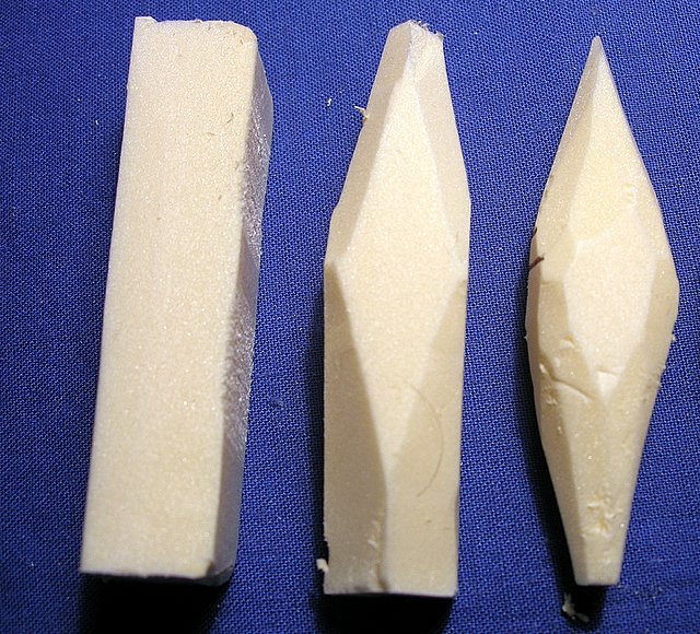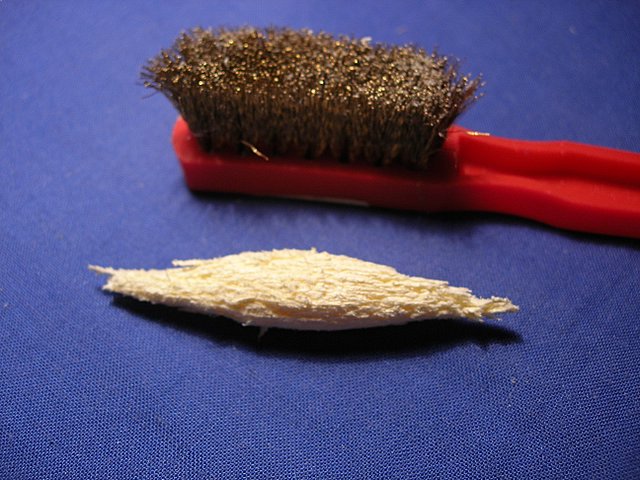 Paso 2º : cortar rectángulos de porexpán de 6 cm. de largo por 1 cm. y medio de grueso. A estos rectángulos se les tiene que dar forma de rombo con el cutters como se ve en la (foto nº 2) . una vez dada esta formas se lija para dejarlos terminado en conos redondos por los dos lados (foto nº 3) . Terminado esto, con el cepillo de alambre se va peinando desde el centro hacia afuera por los dos lados suavemente para darle un aspecto esponjoso como los plumeros (foto nº 4) . (Puede que exista otra forma de imitar estos plumeros y espero que a alguien se le ocurra como y lo ponga en el foro).